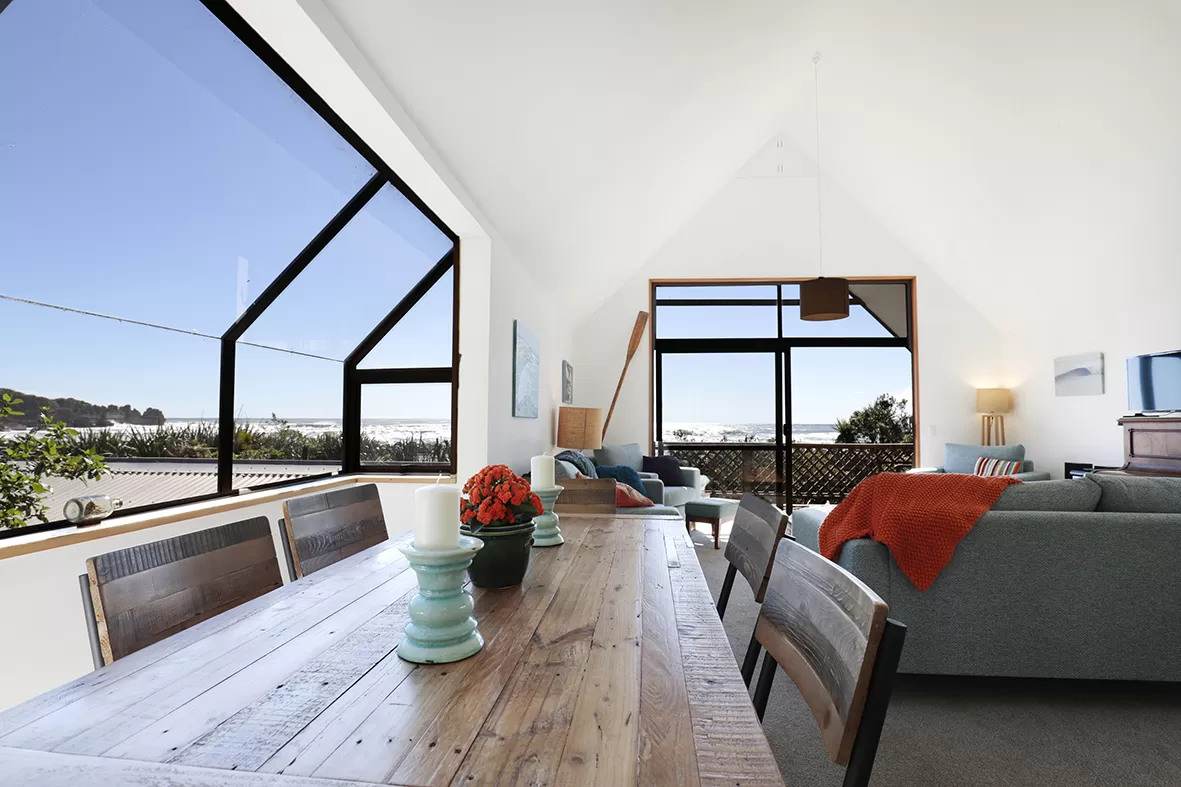 Seascapes, the closest house to the Pancake Rocks, is right beside the beach. Light pours in from windows all around the two-storey home, with a different view from every aspect. Look west and there’s the Tasman Sea, to the south the Pancake Rocks and to the east towering limestone cliffs.